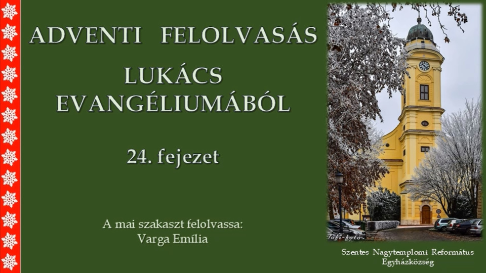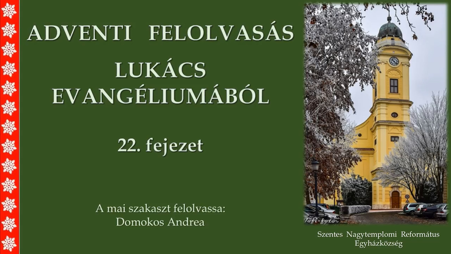 A 2020-as adventben a Szentes Nagytemplomi Református Egyházközség gyülekezetének vezetői olvasnak fel naponként a Szentírásból. Karácsony Szentestéig minden egyes nap egy fejezet szólal meg Lukács evangéliumából, hogy közelebb vigyen bennünket az ünnep lényegéhez, a Jézus Krisztus által hozott megváltás titkának megértéséhez. Szívből reméljük és vágyjuk, hogy - a miénkkel együtt - a Te adventedet is ragyogja be a Világ Világossága, aki volt, van és bizonnyal eljövend! Jövel, Uram, Jézus! Ámen.